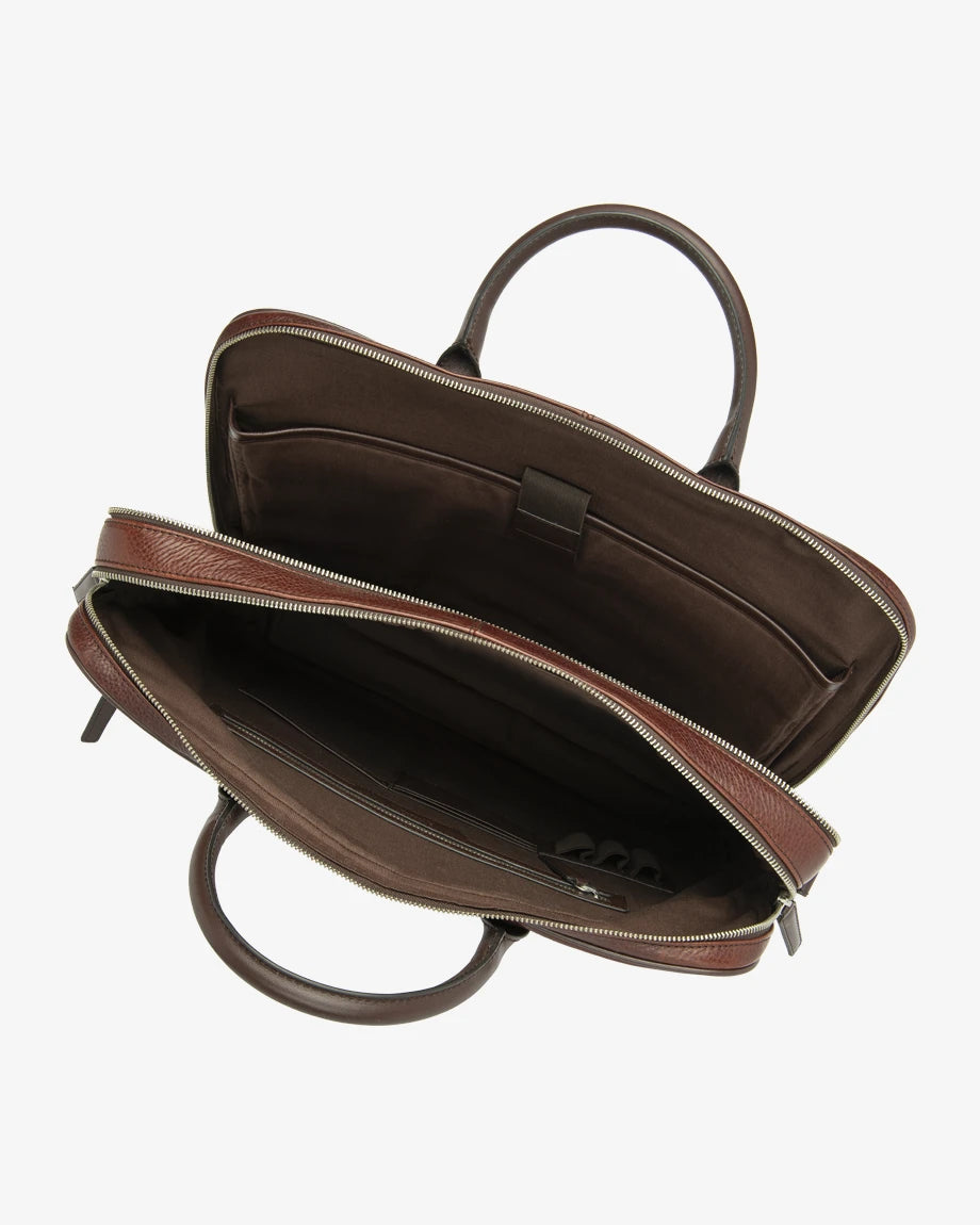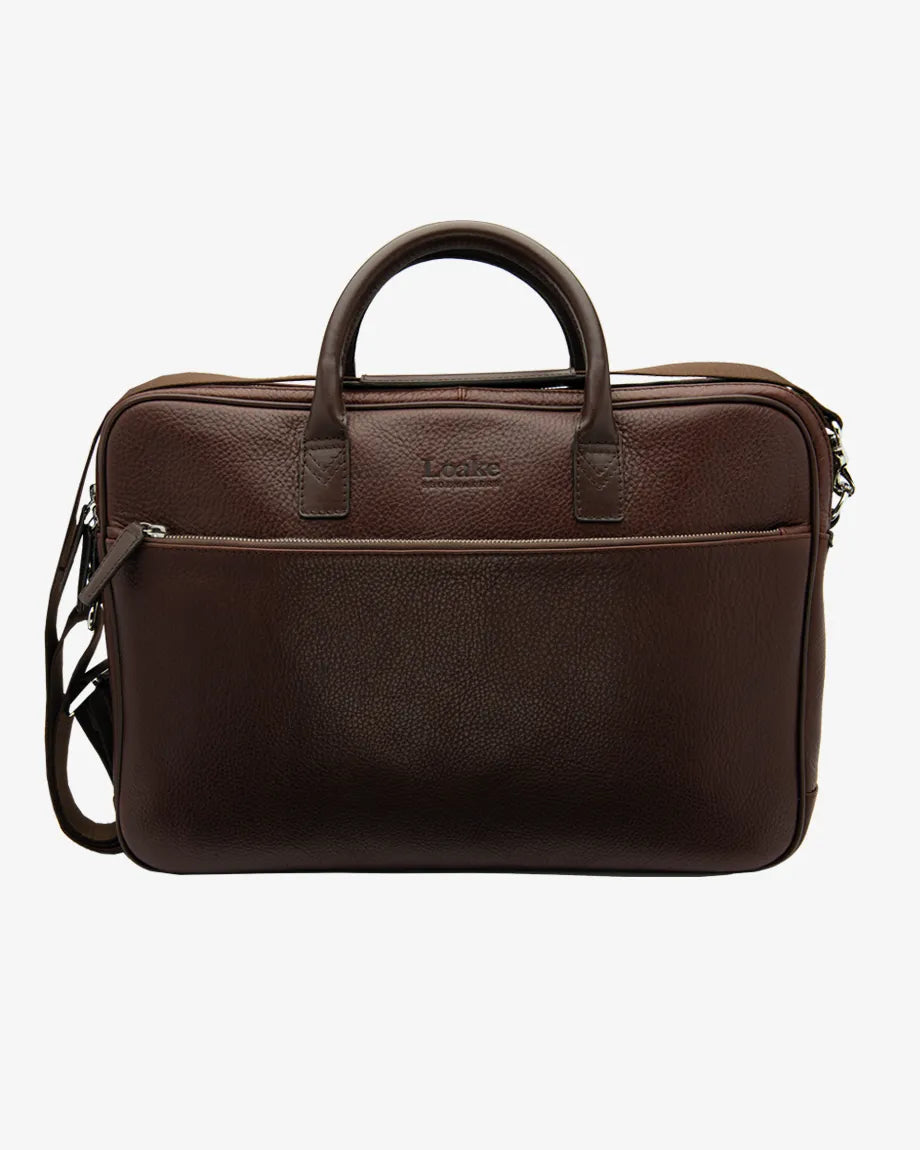 Westminster is our premium calf briefcase. Two big interior pockets with smart storing for pens, papers, computer and all your work necessities. One external zip pocket with attached key holder inside. Padded exterior for extra protection. Comes with detachable shoulder strap. These leather briefcases are designed and engineered in Kettering and made in our high-grade factory in India.
