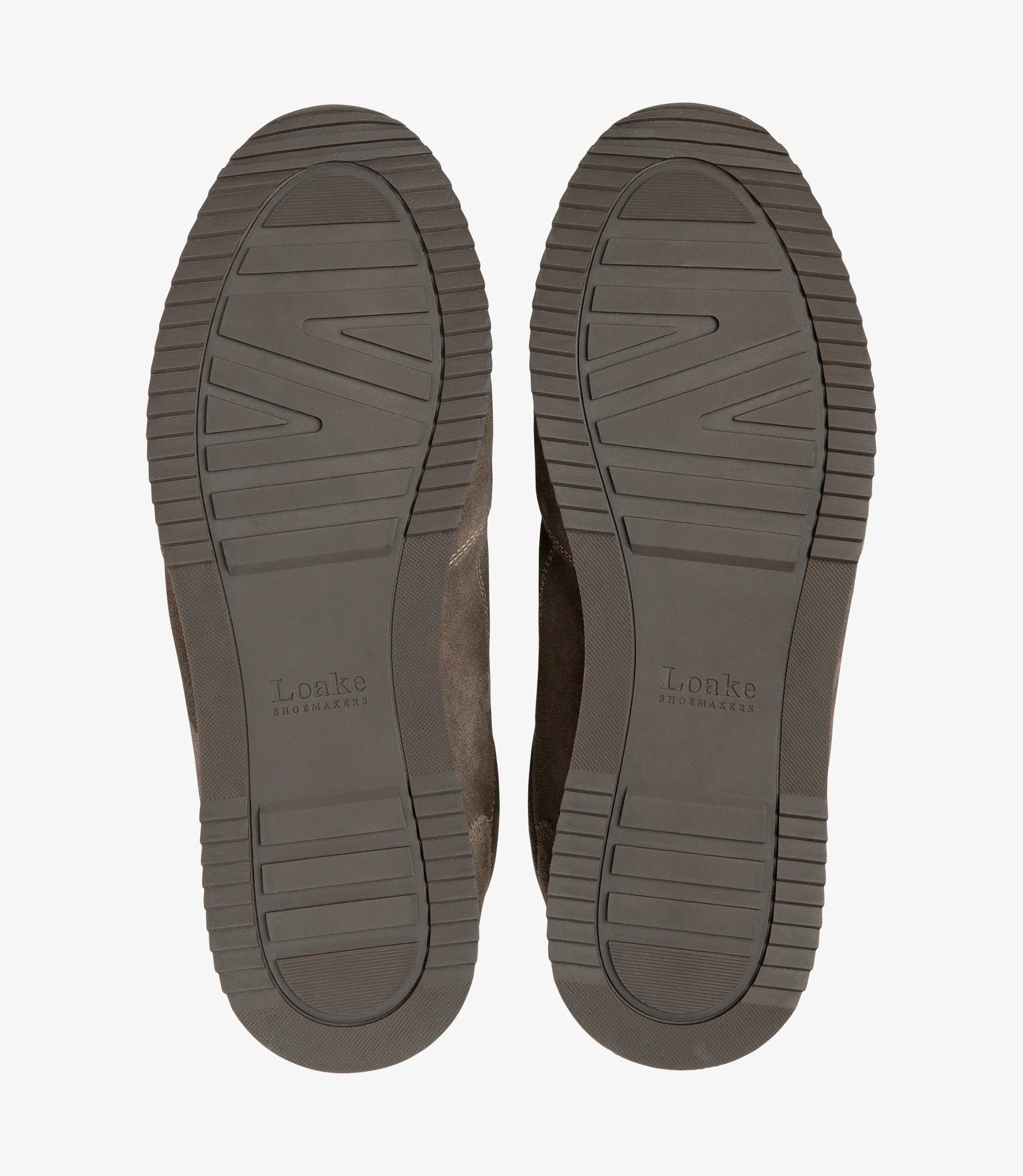 Anthracite grey suede trainer featuring cemented rubber soles. Bannister is fully leather lined and uses the Trainer last shape in F width.