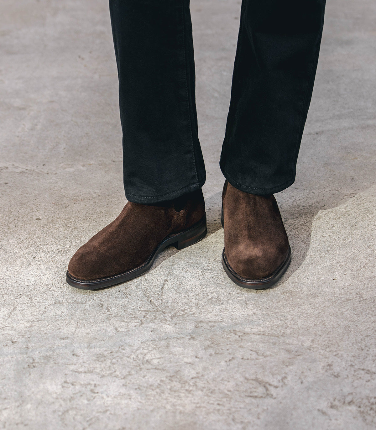 Our Emsworth is a plain Premium Chelsea boot in Dark Brown Suede. Features Goodyear Welted Shadow rubber sole for greater longevity and grip, whilst maintaining a slim profile. Capital last shape in F fitting.
