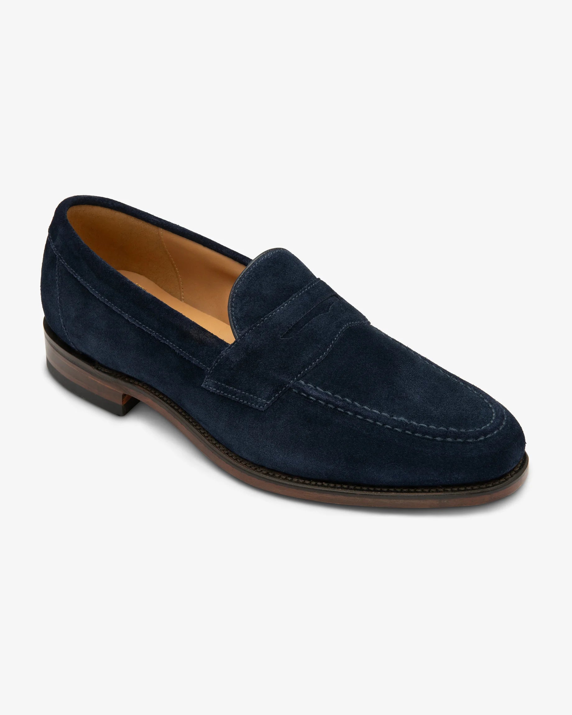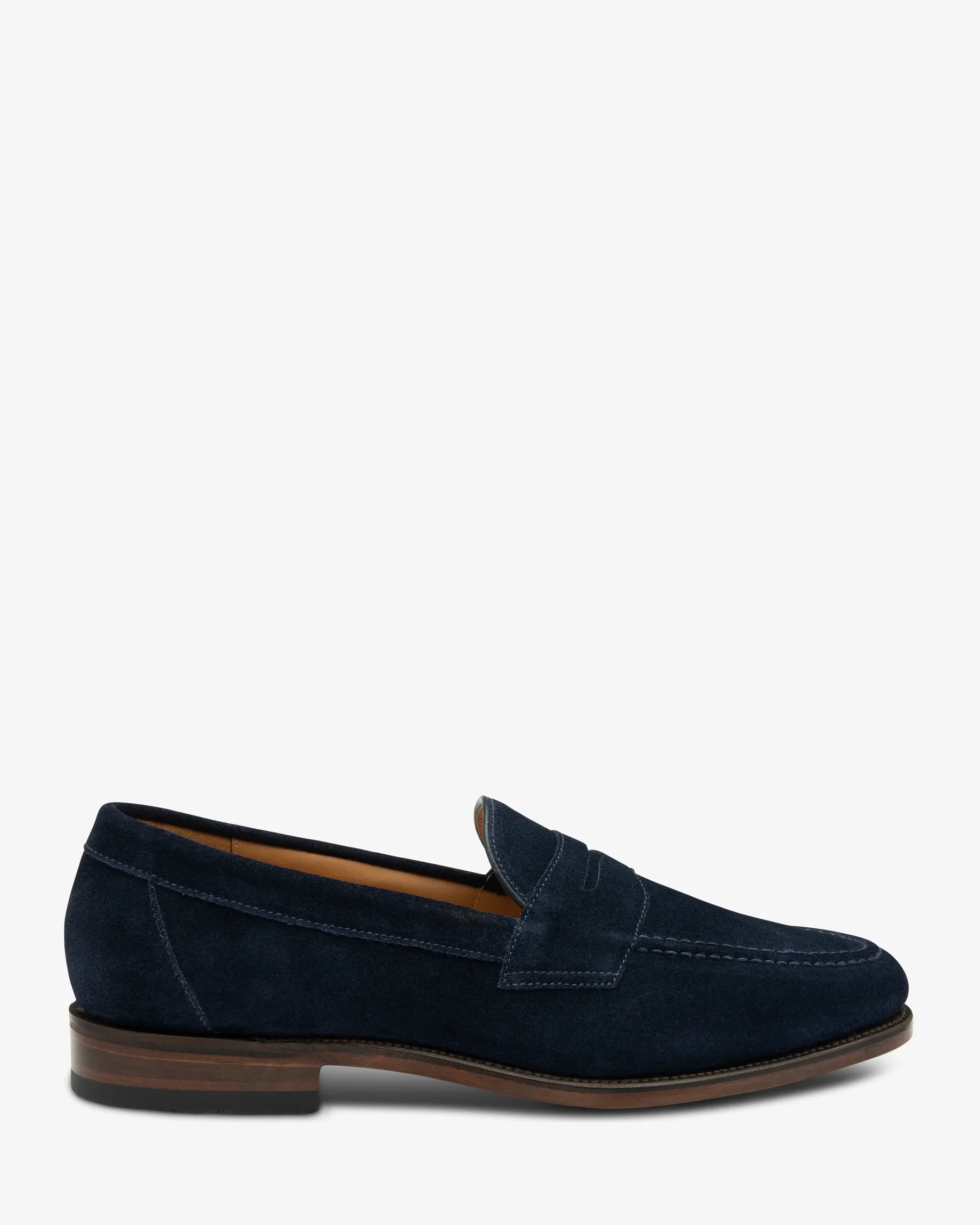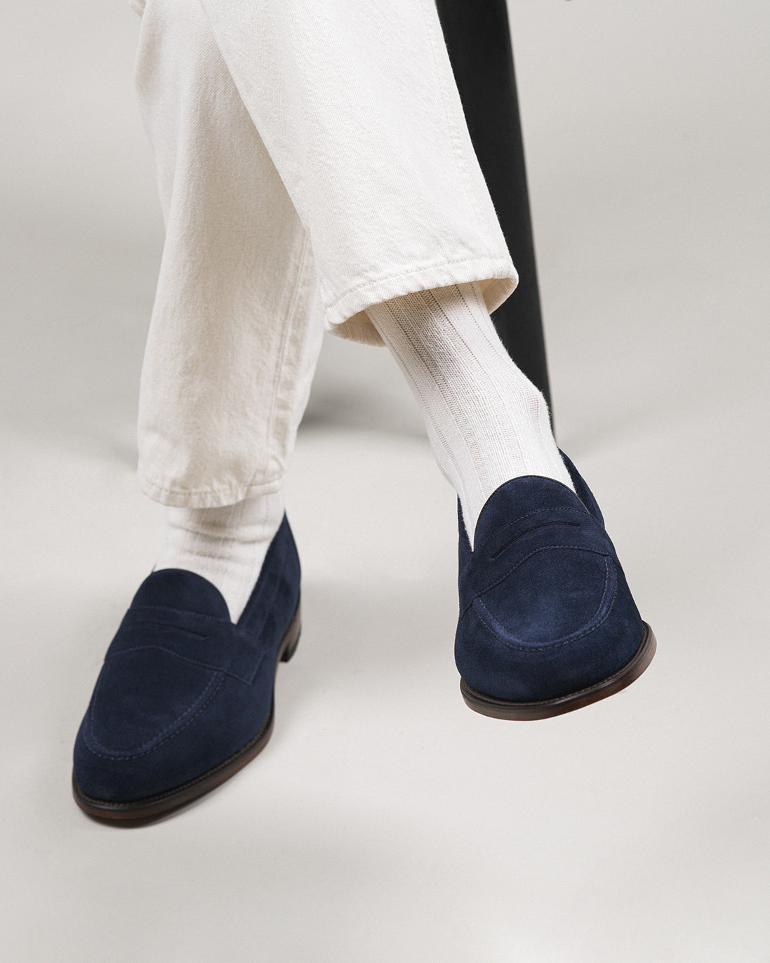 Penny-Loafer – ein echter Klassiker, den jeder Gentleman in seiner Schuhgarderobe haben sollte. Dieses Modell wird aus einem dunkelbraunen Veloursleder im Farbton Chocolate gefertigt und besitzt eine einfache Ledersohle. Es entsteht auf unserem neuen Loaferleisten mit der Bezeichnung College/F, einem Leisten mit weich zulaufender, mandelförmiger Zehenpartie, der sowohl zu formeller als auch zu legerer Kleidung hervorragend passt.
